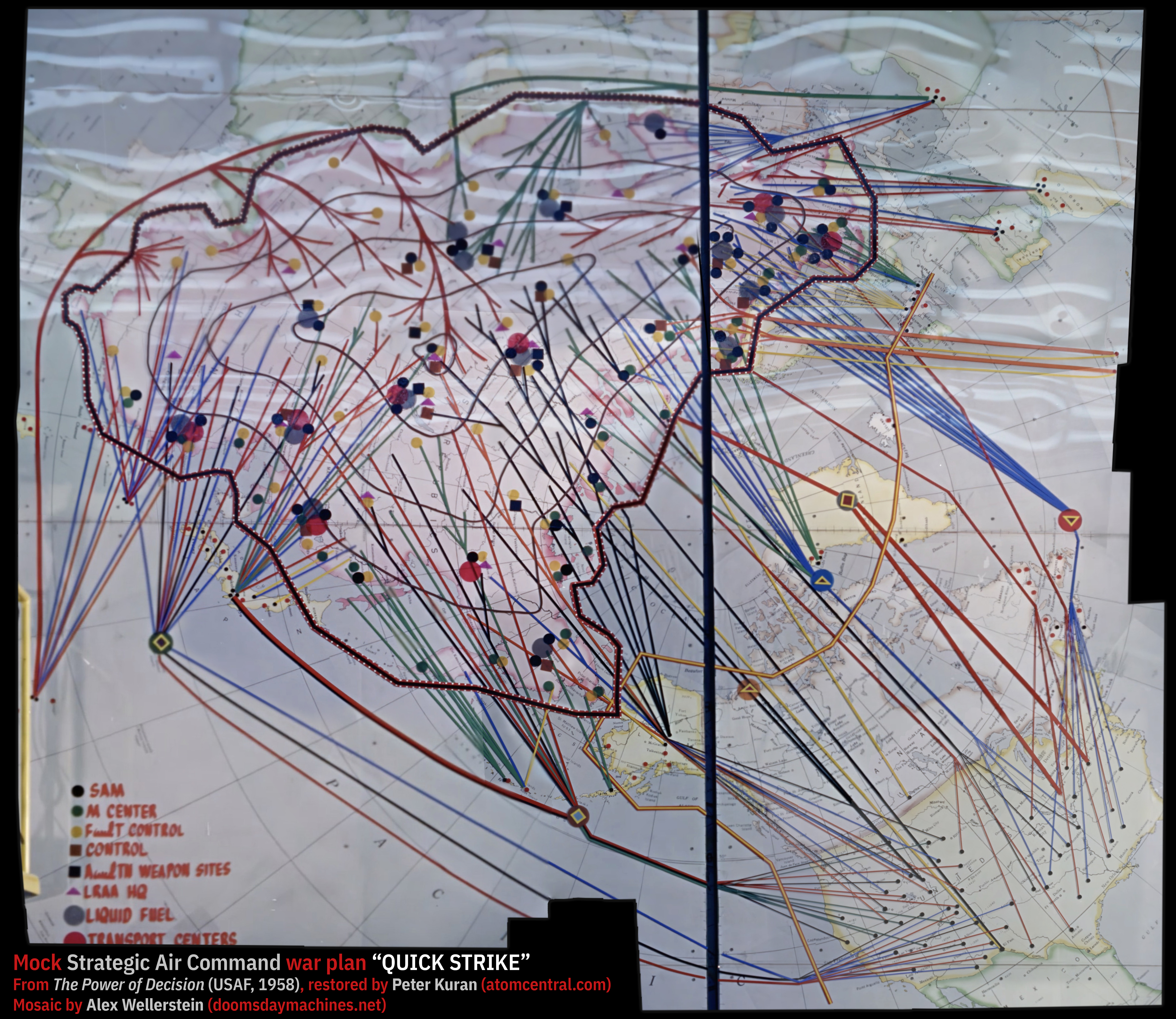 I’ve been teaching with the diagrams of QUICK STRIKE for over a decade now. I think there’s real value in showing how the abstractions of deterrence theory were rendered into a horrific, tangible, effective killing machine at the height of the Cold War. I sometimes have students who (adorably, naively) ask: “but would they actually have used the bomb in this way?” And being able to point to this proud, in-house, top-secret, self-congratulatory film is one easy way to answer that question. It sure looks like they would have.