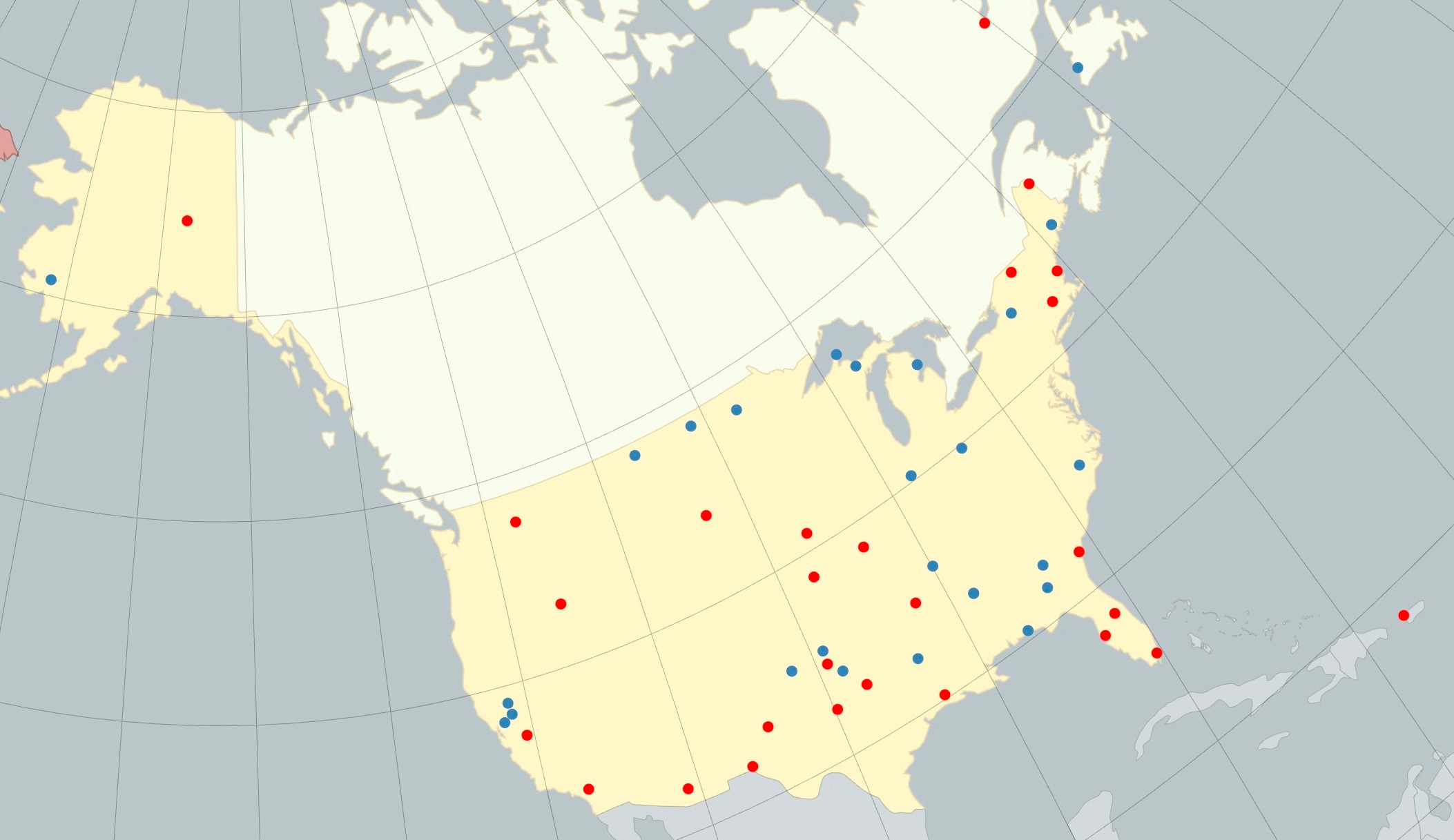 For the sake of comparison, I’ve created a quick little map, below, that approximates the same map projection as the screenshot of the United States above, with actual SAC bases, including nuclear-armed ones, shown as dots, for around the period of the film’s creation and its near-term projected future. This is not a complete map of SAC deployments at the time: the projection necessarily leaves out many, such as the weapons deployed in French Morocco (Ben Guerir, Nouasseur, and Sidi Slimane), Greenland (at Thule), Guam, Okinawa, Spain (Morón, Torrejón, and Zaragoza), and the United Kingdom (at Brize Norton, Fairford, Greenham Common, Lakenheath, and Mildenhall).4 The point here is that one can readily see that these maps do not have much in common — the data does not line up, except in a few places that might just be random.