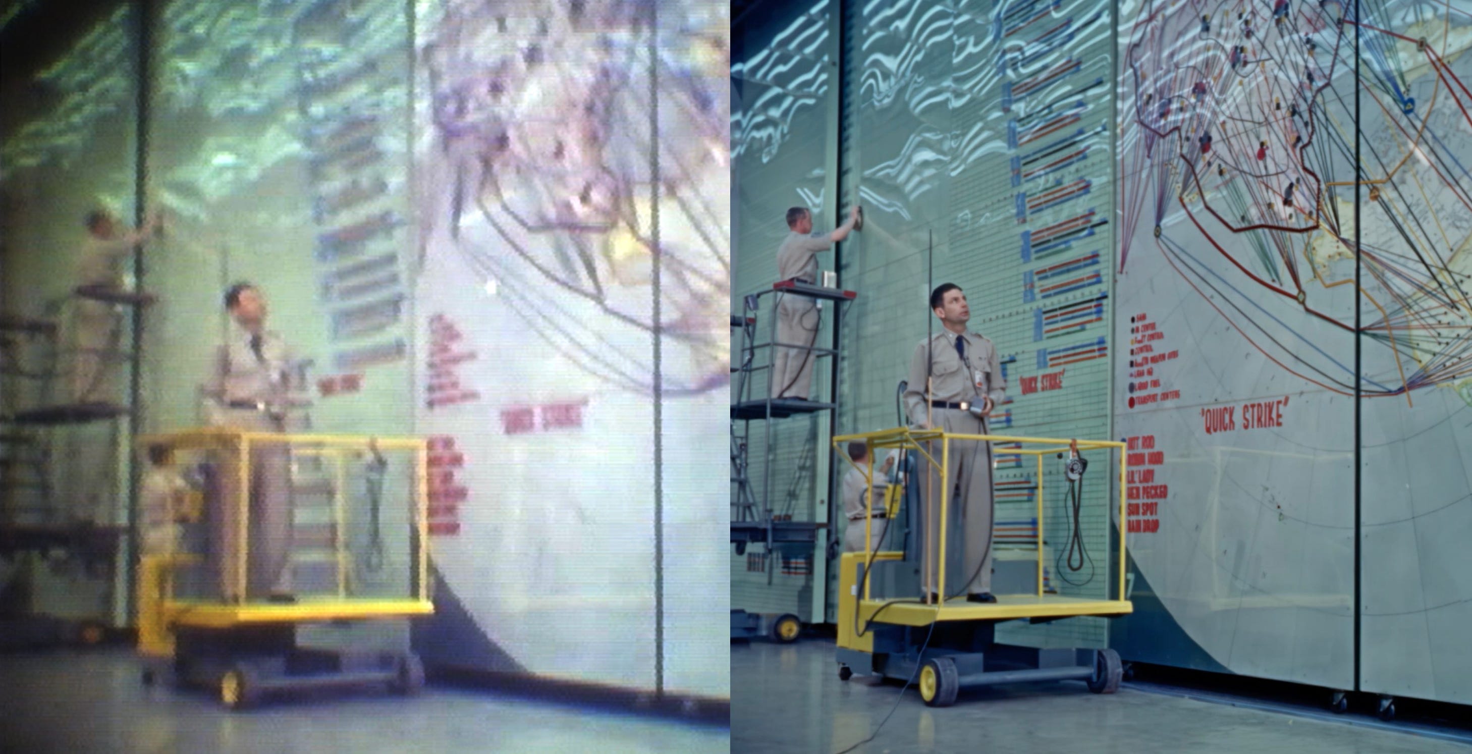 I’ve created a mosaic out of all of the screenshots of the Big Board showing QUICK STRIKE in the film. This was done with over a dozen carefully selected images of the restored film and trial-and-error with Photoshop’s Photomerge feature, careful hand-masking of layers to get the highest resolution possible, and then an overall straightening of the piece. Here it is in its “raw” form: