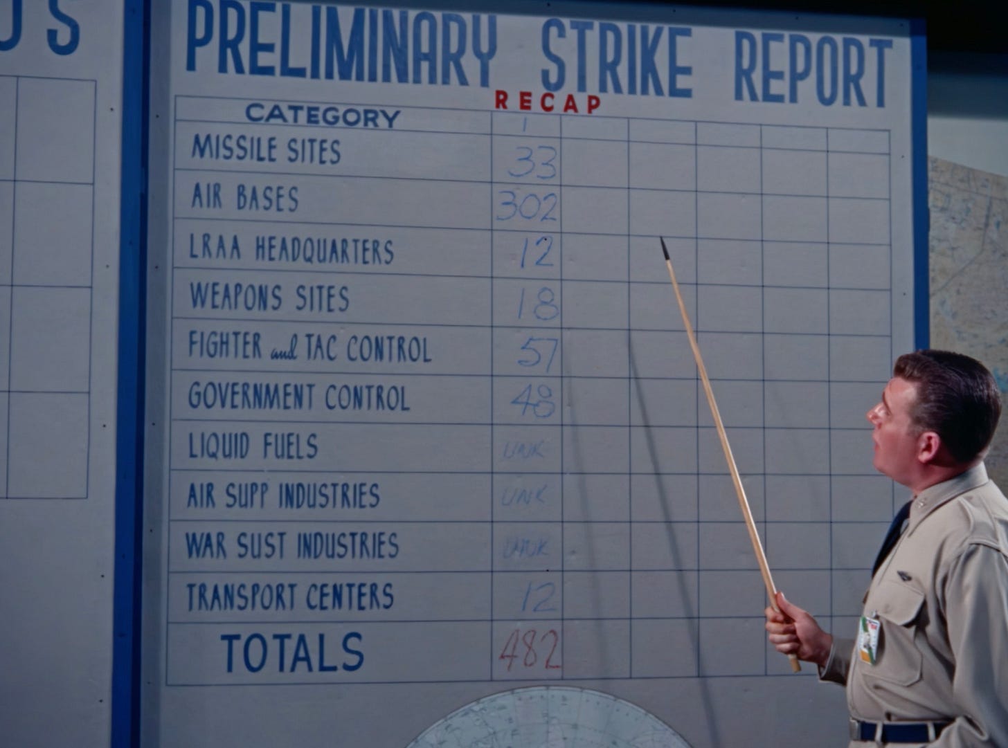 Later in the film, they do a “preliminary strike report” (above) with categories that mostly overlap with the map categories. You can see that a single category, “Missile Sites,” has perhaps absorbed both “SAM” and “M Center.” We also have a clarification that “Control” is probably “Government Control.” We also have two categories not indicated explicitly on the map: “air supp[ort] industries” and “war sust[aining] industries.” Again, all of the rhetoric of these targets is about counterforce targeting.