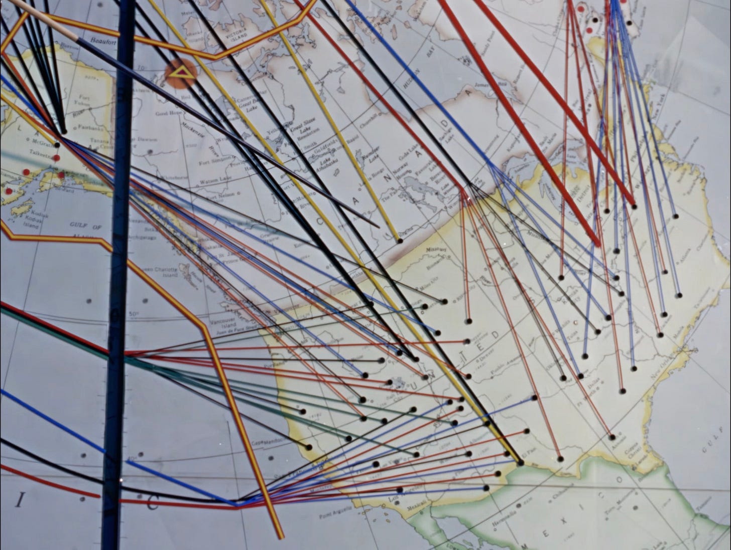 There are two additional sets of borders added to the “base” map: early warning radar lines (or “nets” as they say in the film). The black line with red and white borders around Eurasia is the Soviet warning network, and the yellow-on-red line around North America is its American equivalent (i.e., the Distant Early Warning Line and other radar stations).