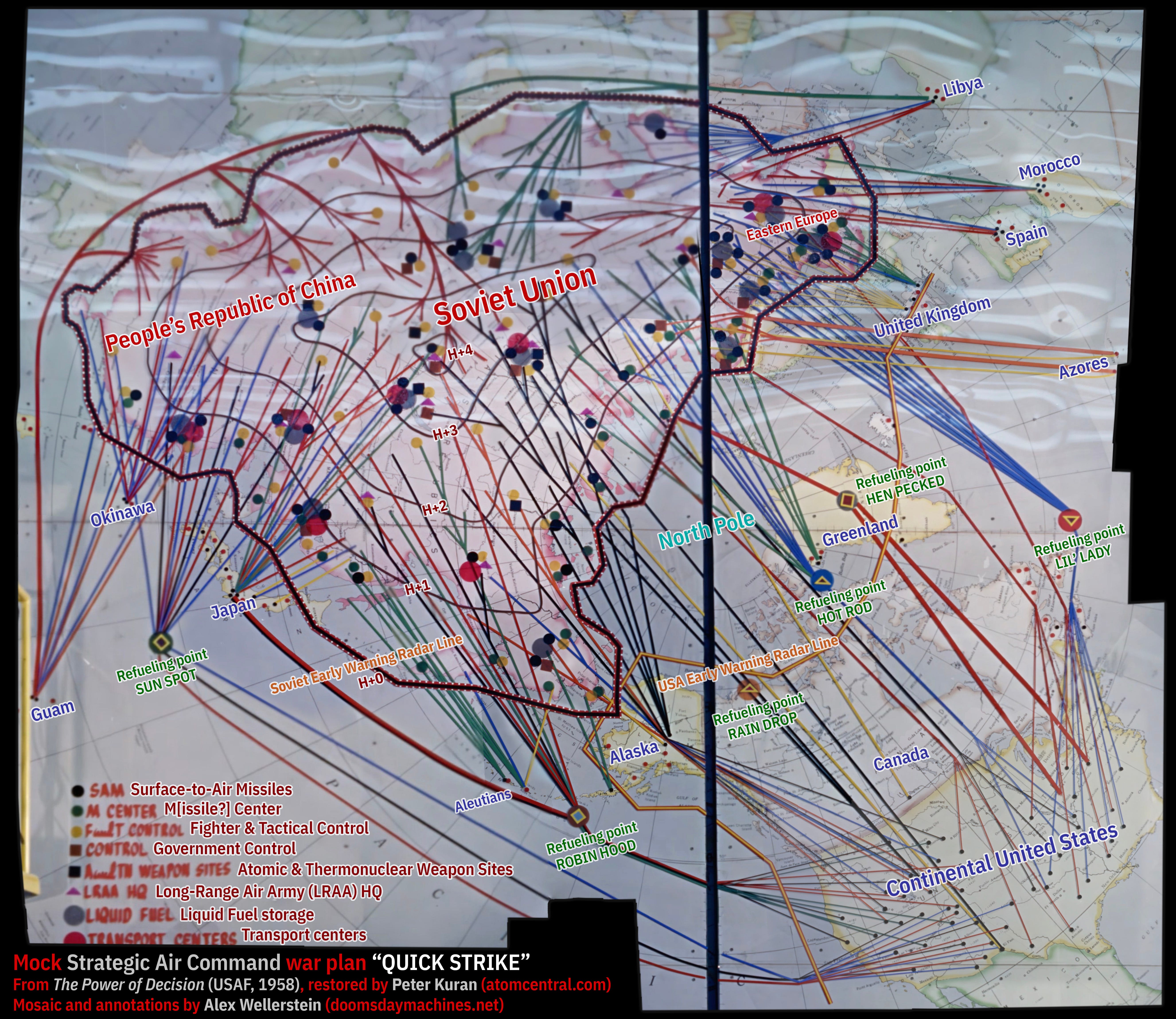 One important thing: the bases marked in the United States are mostly nonsense. The location of SAC bases in the USA is not (and was never) secret, and we also know (from declassified reports) where SAC stored nuclear weapons in 1958. A few of those “launch bases” are correct-enough — e.g., Amarillo AFB, March AFB, and Biggs AFB are in cities marked as bases — but a lot of actual bases are missing, and a lot of the labeled bases are just totally wrong/nonexistent. The base locations in The Power of Decision are bogus. This is something I can say with much more authority now that we have the restored version of the film, as it was harder before to see really where everything was located. Again, this is meant to be evocative of an actual war plan, and I think it is that, but it should not be mistaken for an actual war plan.