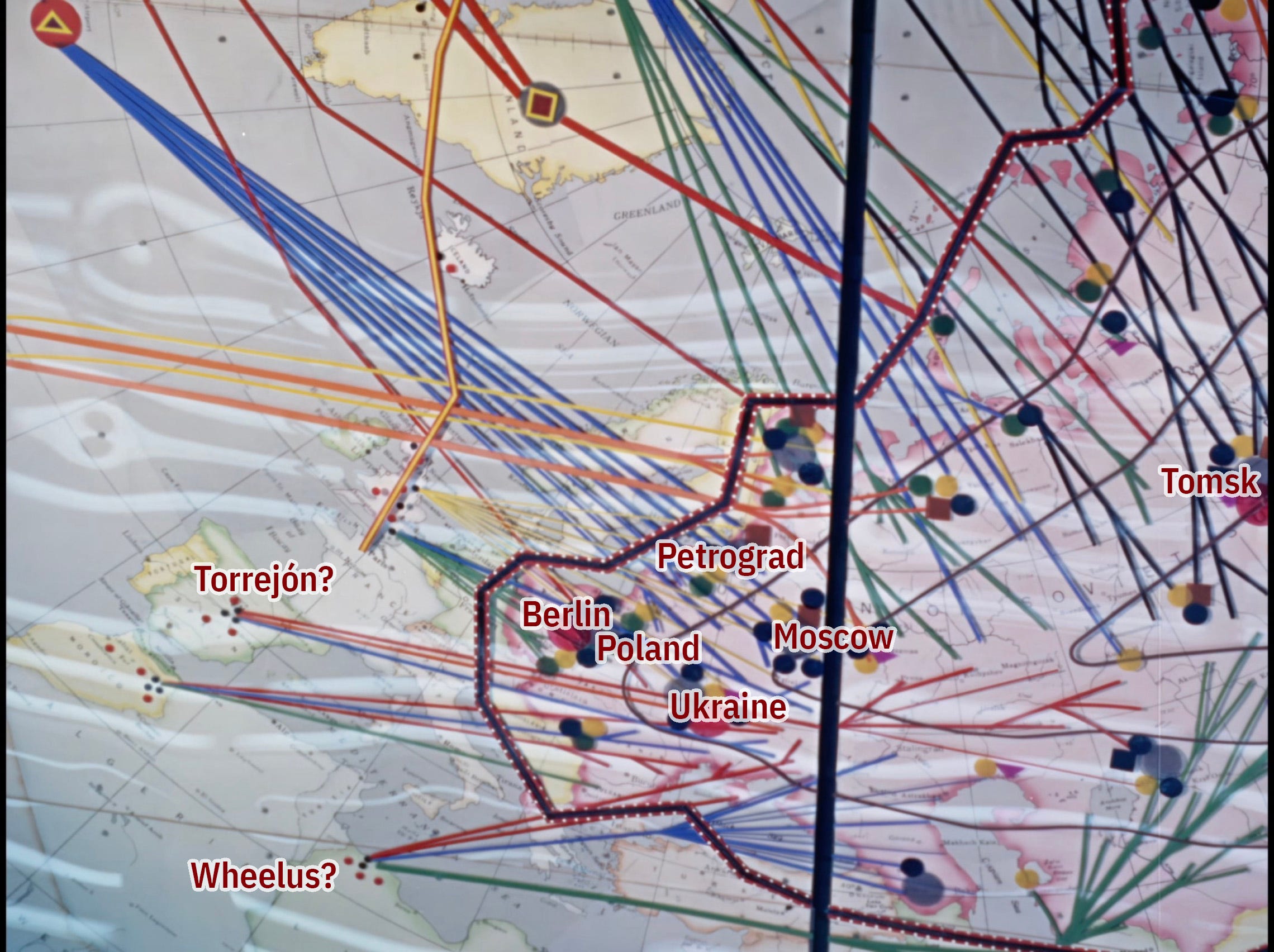 Similarly, the orange lines coming out of the Azores (another detail that had confounded me until the restored film was available) are in a similar category as Wheelus: as far as I know, the Azores did not store nuclear weapons, but do have important US air bases in them.