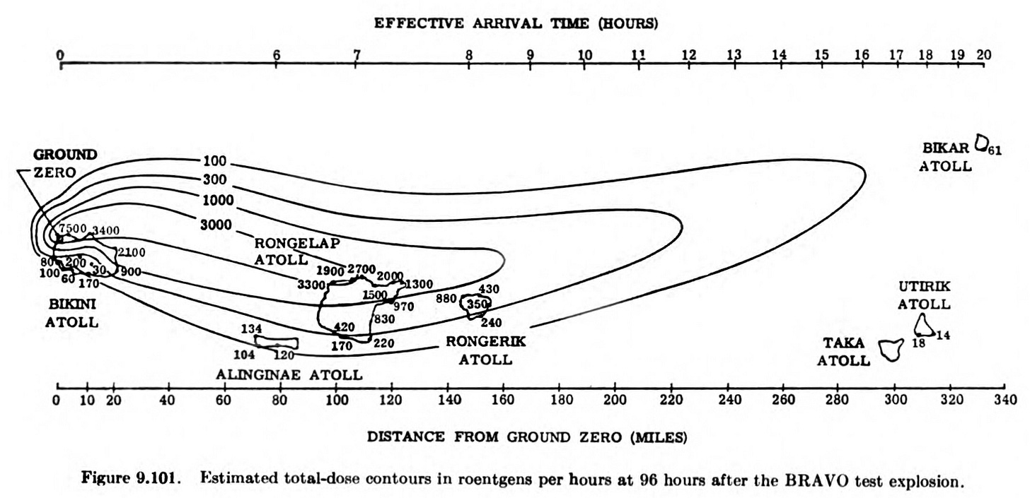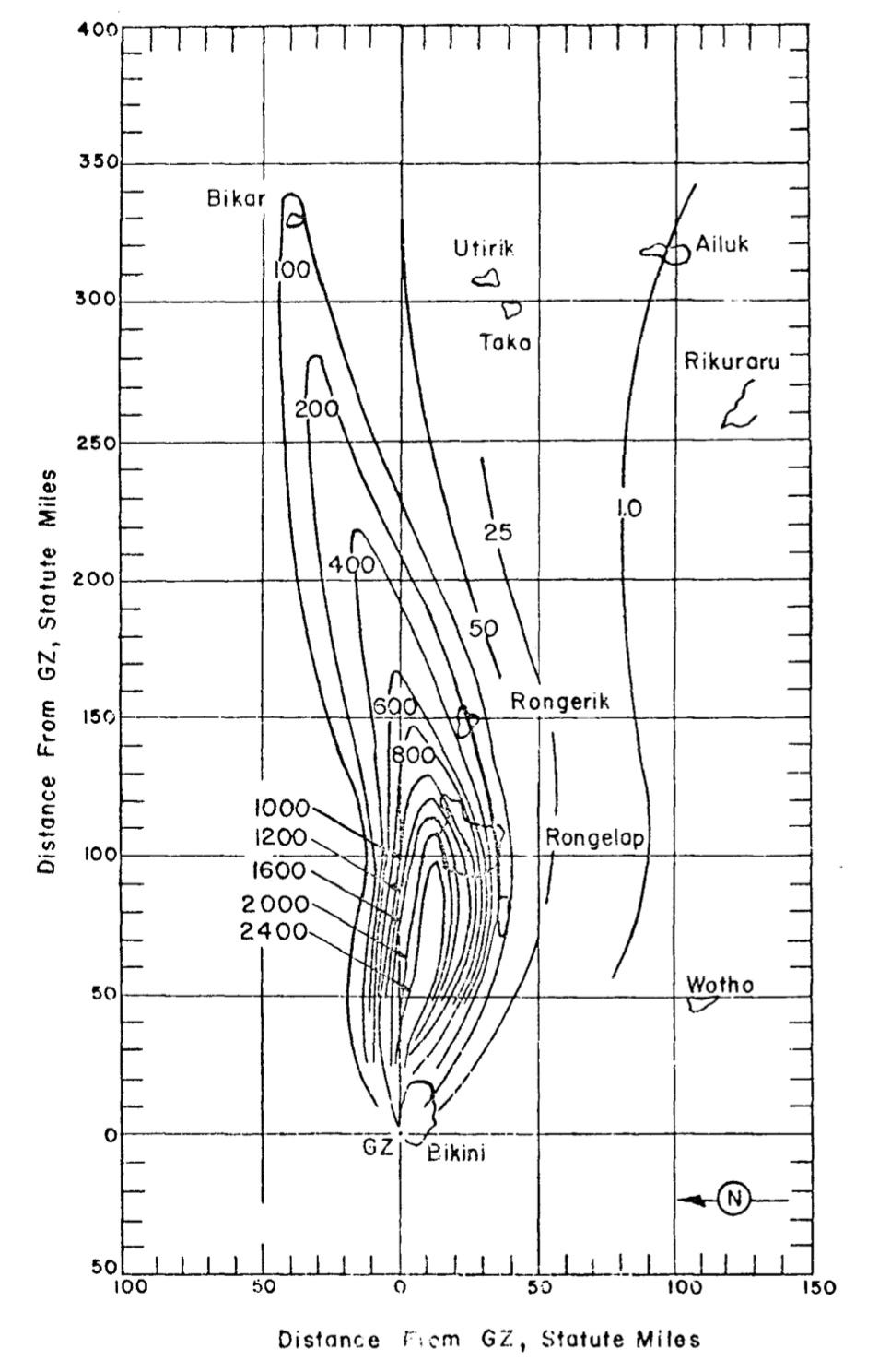 “Local” fallout contours on this level had not been contemplated prior to the BRAVO test. (Why not? That’s a longer question, one I will be writing more on in the near future…) The prior experience with nuclear fallout for kiloton-range weapons had led scientific and military planners to more or less consider this kind of downwind fallout to be a nuisance, not a serious threat, at least not compared to the kinds of threats you get from the immediate effects of a detonating atomic bomb.