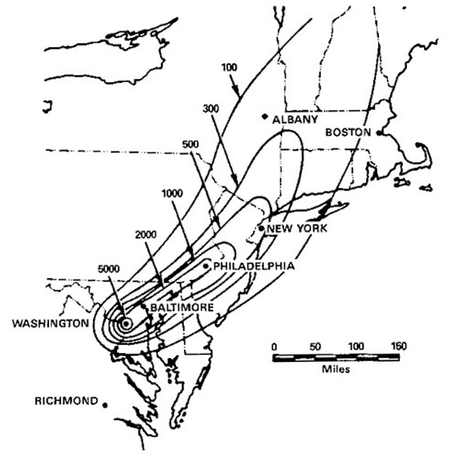 The above model was later re-rendered as the H+96 total dose contour printed in Samuel Glasstone and Philip J. Dolan’s The Effects of Nuclear Weapons, 3rd edn. (U.S. Atomic Energy Commission and U.S. Department of Defense, 1977), which people are more familiar with: