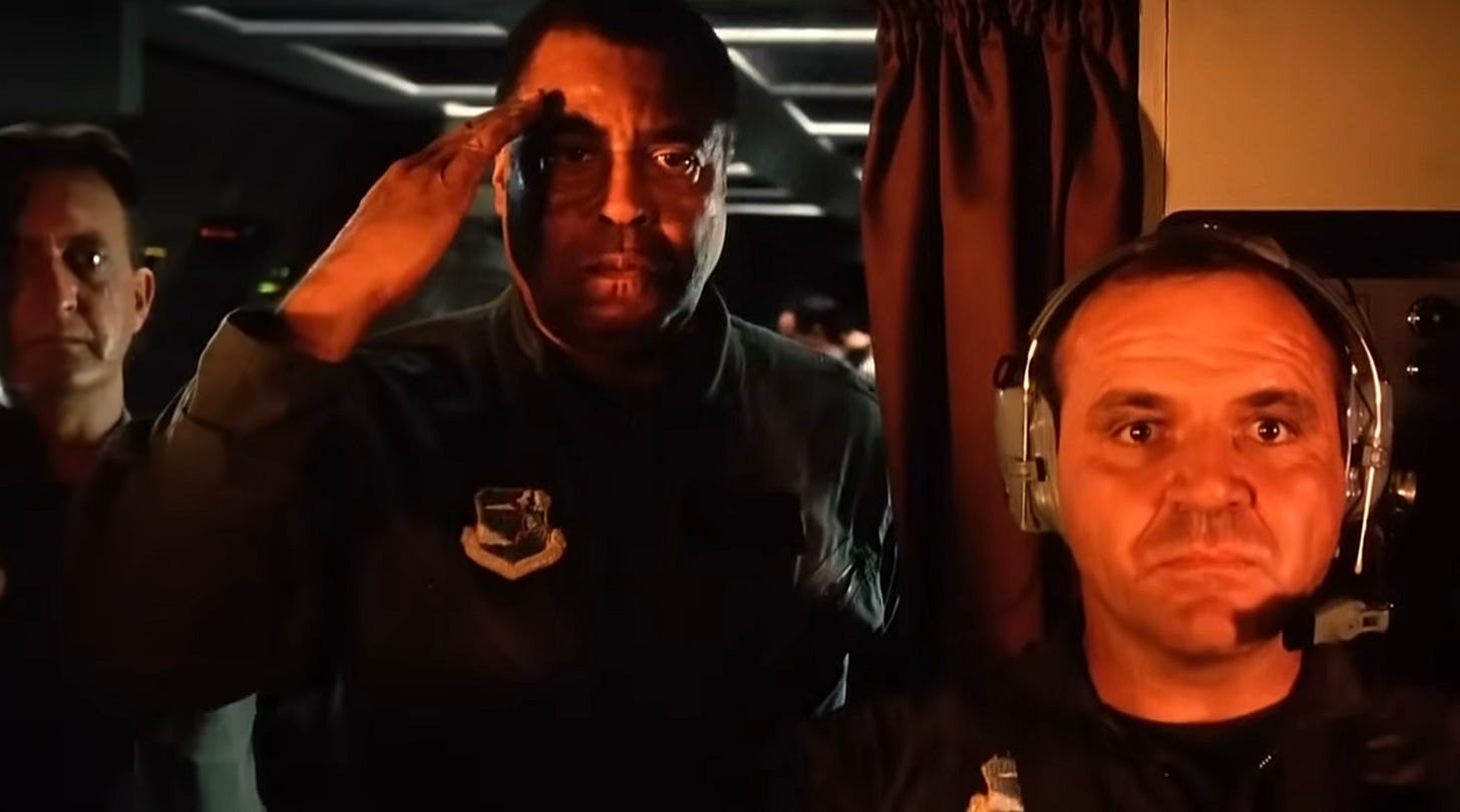 Still, the value of centering that part of the “action” around a bomber crew is that they do have some time to deliberate, their actions are not wholly automatic, and they could, in principle, rebel. It’s much harder to imagine ICBM launch commanders doing that sort of thing. There is a decent exchange to this point between the pilot and the copilot: “You would have turned a Minuteman key without thinking!” “They gave me time to think.”