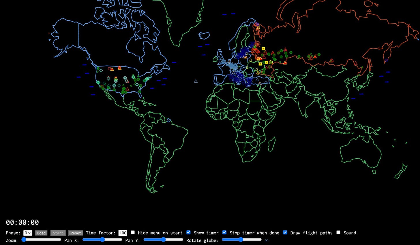 The code could read these data files and then “step” through the time in regular intervals, triggering, say, a missile launch, and then locating (and visualizing) where that missile ought to be at any given time after the attack. We used some very simple assumptions for the speed of everything, reasoning (if I recall) that the fine-grained differences a) would not likely be visible at this scale of the map anyway, and b) didn’t matter for the evocative purposes of this visualization (which was not meant to be any kind of “perfect” simulation). For MIRVs, the code treated all of them as the same missile until about 50% through the trajectory, in which it then split them into multiple warheads. This was, again, somewhat arbitrary.