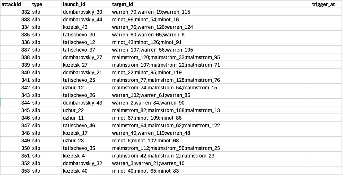 The “target_id” is a list of locations that are being aimed at by the weapon. In some cases there would be a single location, but in some, as above, you can tell they are MIRVed, and a single missile is meant to hit several different targets. “trigger_at” was a timestamp (in the above, they are set to begin immediately) at which this part of the attack would take place.