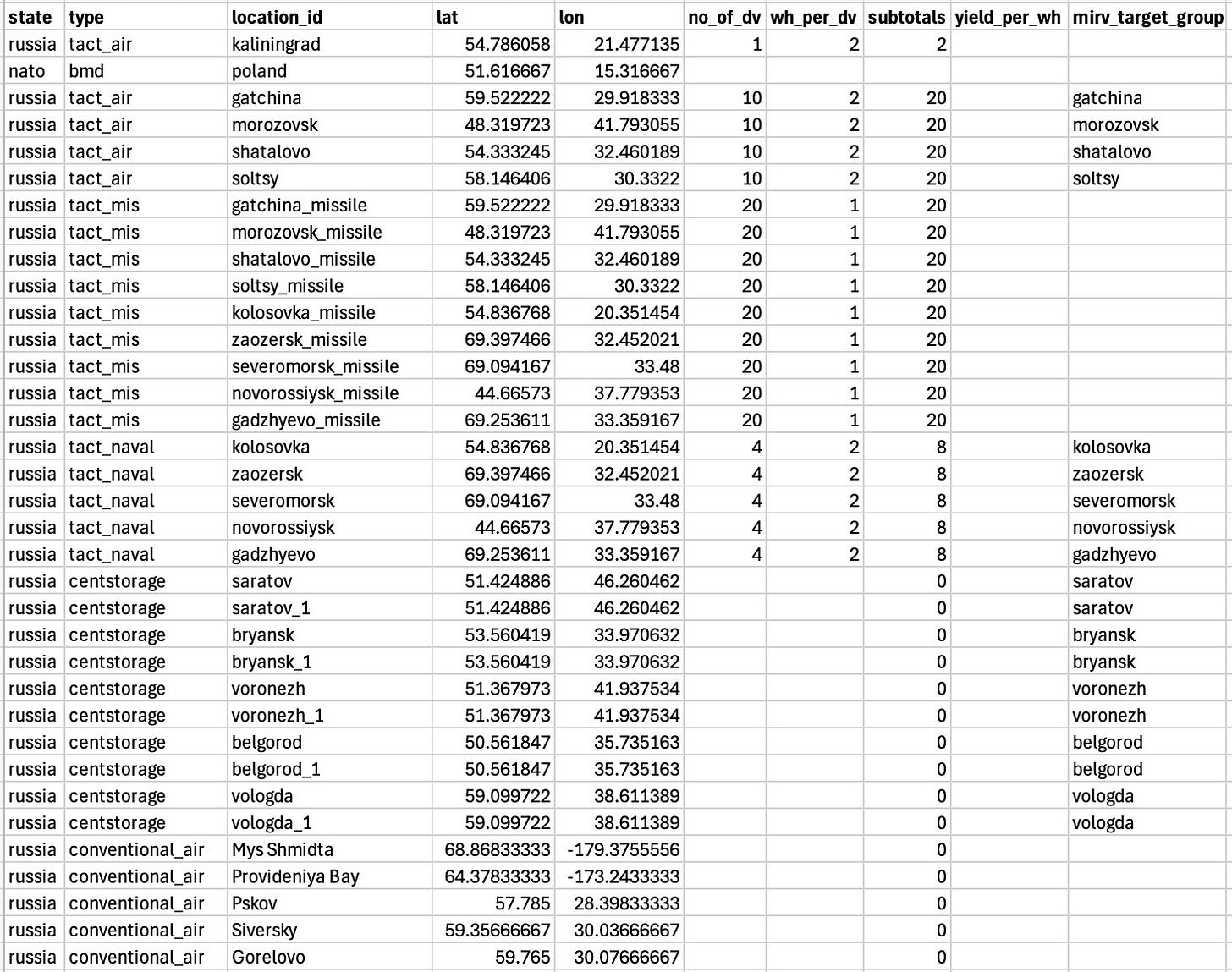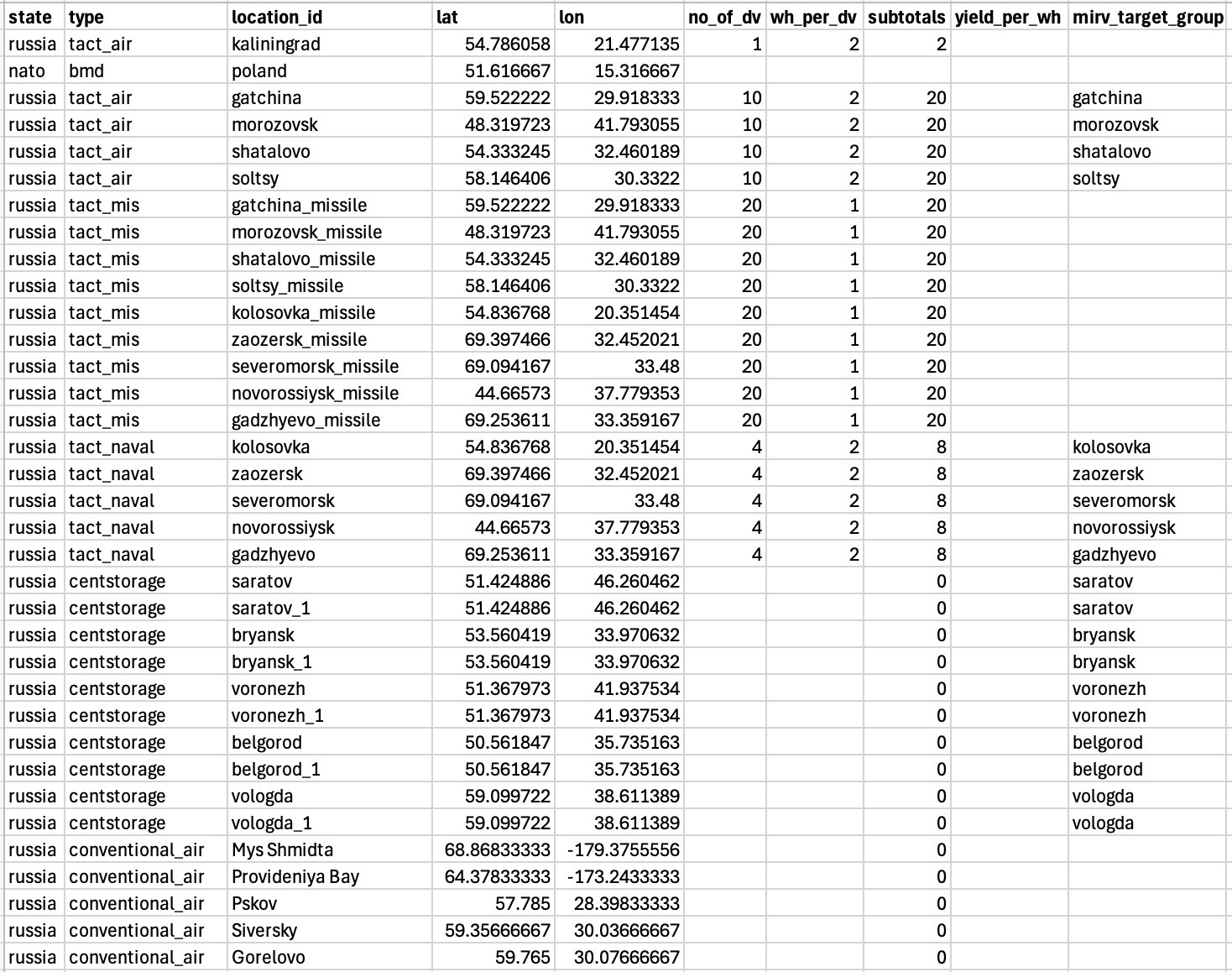 Each “location” clearly had a unique ID (e.g. “saratov_1”). The latitude and longitude were its initial location, obviously. “no_of_dv” defined the number of delivery vehicles (which could be missiles or planes), “wh_per_dv” was how many nuclear warheads were contained on each delivery vehicle, and “subtotals” looks like it is just the total warheads per location if it had warheads (which I think was just for our own record-keeping; it is not used in the code). “yield_per_wh” is the explosive yield per warhead and does not seem to have been used (that would only have been used for the casualty calculation and I don’t think we used these files for that). I think “mirv_target_group” was something used for planning purposes because it doesn’t show up in the visualizer code anywhere.