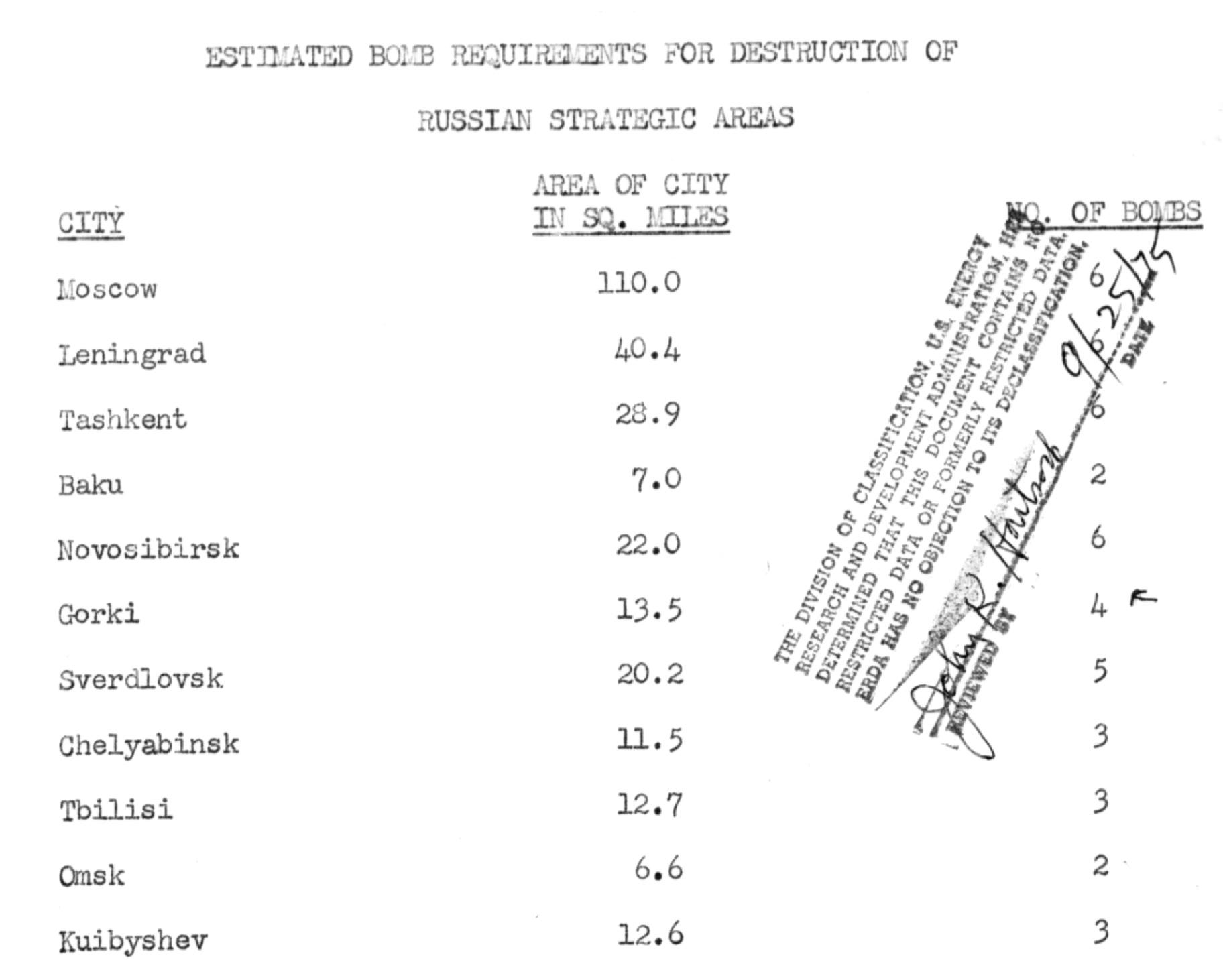 Based on this, and other analysis of the Japanese attacks, they came up with an estimate of how many bombs they would need to do devastating damage to each city in the Soviet Union and Manchuria, assuming the weapons available were the same as the ones used against Japan. They ended up with a table of “Estimated Bomb Requirements for Destruction of Russian Strategic Areas” for 66 Soviet cities, over 900 square miles of which to destroy, requiring 204 atomic bombs.