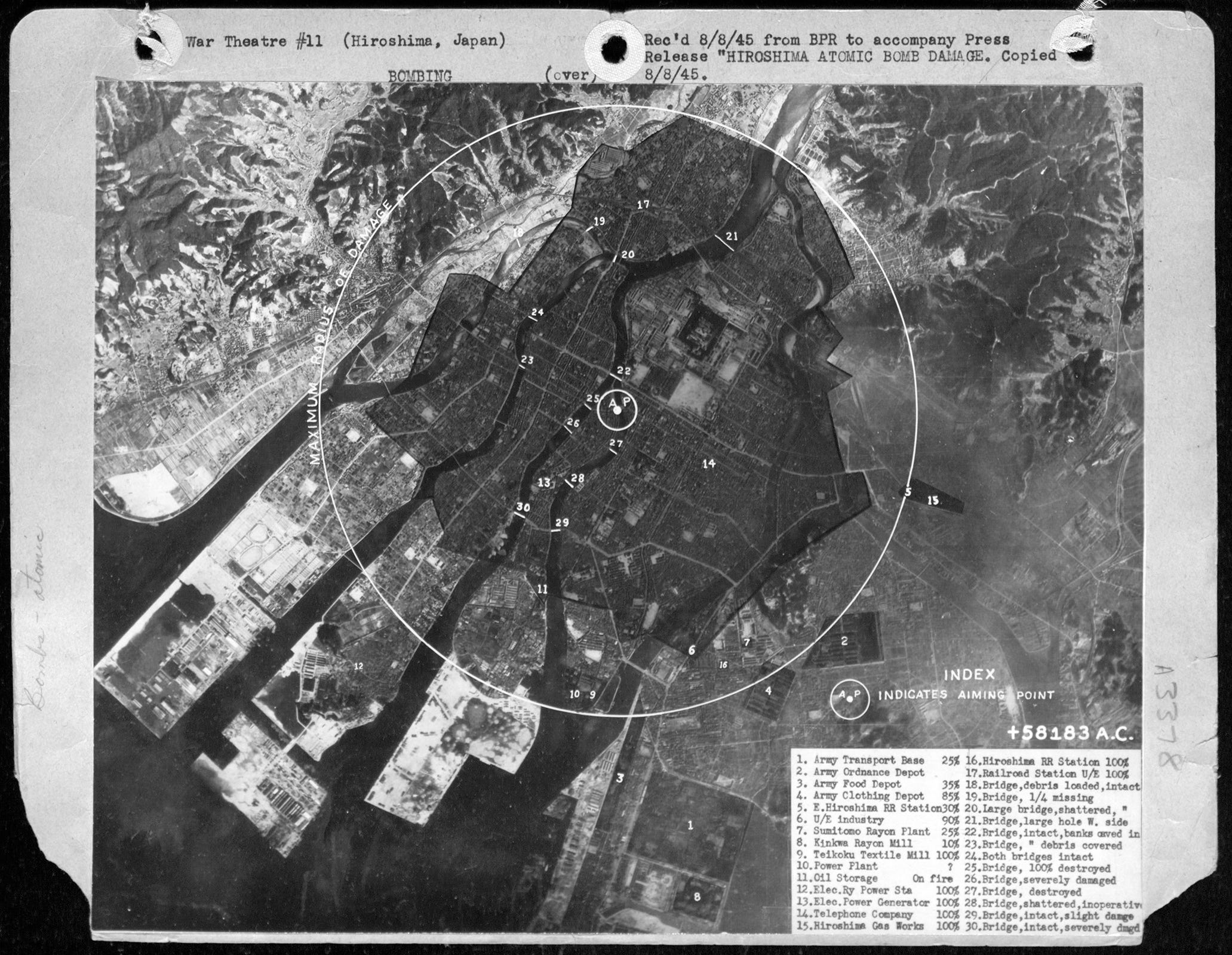 For the damage-potential, they had a preliminary survey by the Joint Target Survey, dated September 1, 1945, of the specific damage done at Hiroshima and Nagasaki, baed entirely on aerial photographs of city. (Only after the formal Japanese surrender, the next day, would US troops and scientists be allowed to actually visit the cities and conduct a more thorough survey.) They concluded that within about 6,000 feet (1.3 mi / 1.8 km) of ground zero, the number of buildings damaged was 100%. As you moved outward from ground zero, the percentage dropped off, until around 18,000 feet (3.4 mi / 5.5 km), at which it became negligible.
