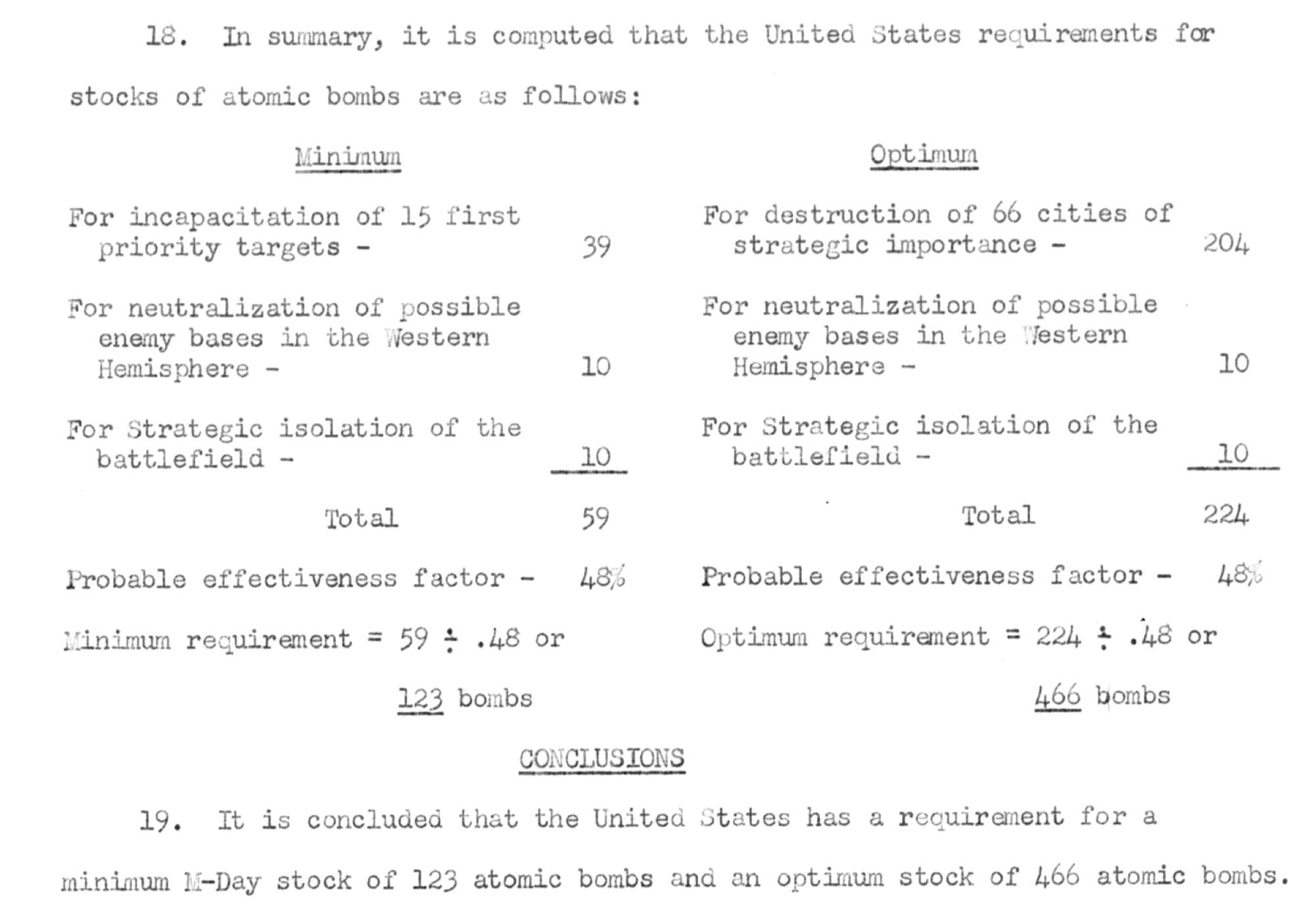 From this kind of reasoning, the report then moves on to set some idealized numbers. To destroy the first 15 high priority targets would require (by their logic) 39 atomic bombs. Add 10 more for “neutralization of possible enemy bases in the Western Hemisphere,” another 10 for “strategic isolation of the battlefield” (tactical use) and you end up with 59 desired bombs. But, they reasoned, the weapons will not be all accurately delivered. They assume that through enemy action and inaccuracy, only 48% of the bombs launched might reach their targets. So you divide 59 by 48% and end up with a minimum need for 123 atomic bombs in the American stockpile.