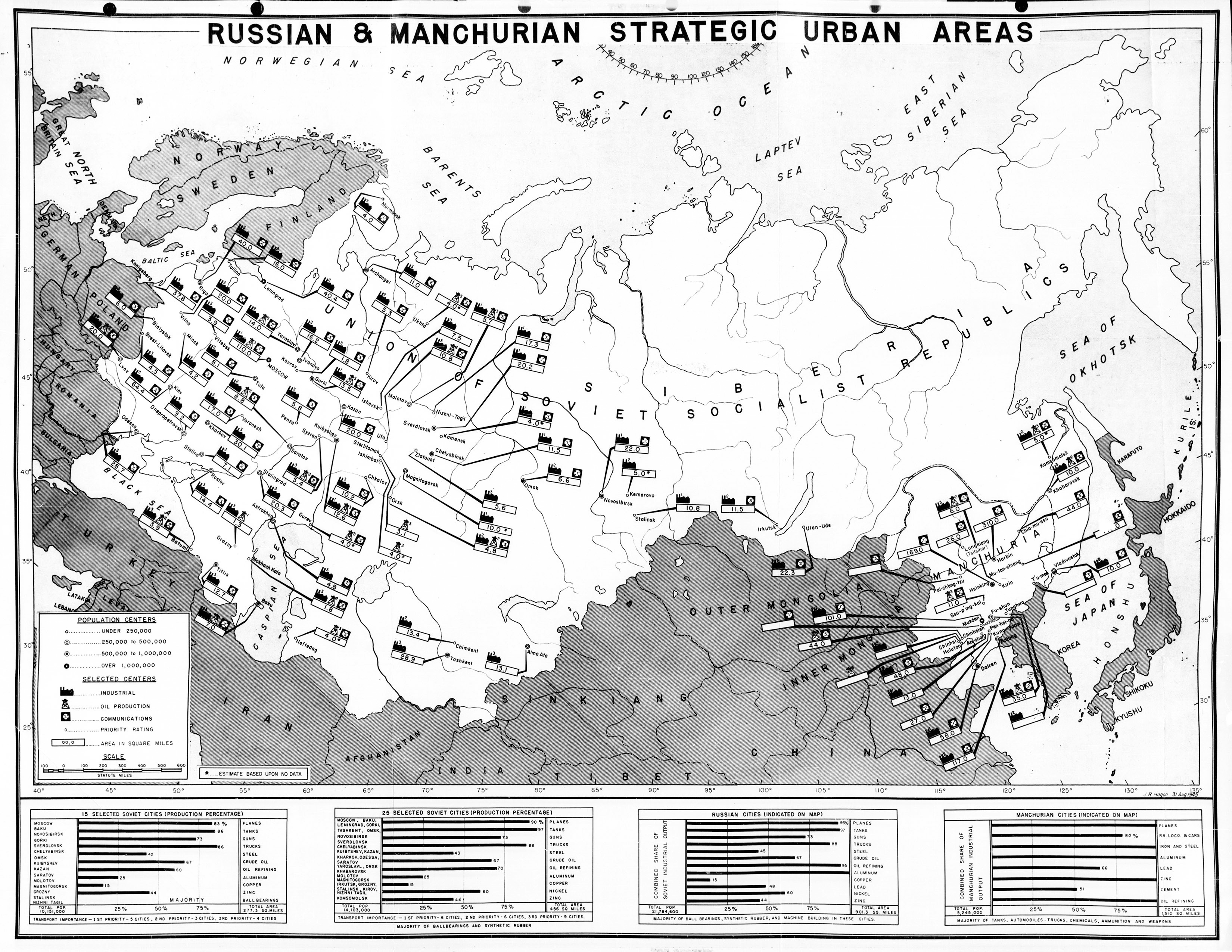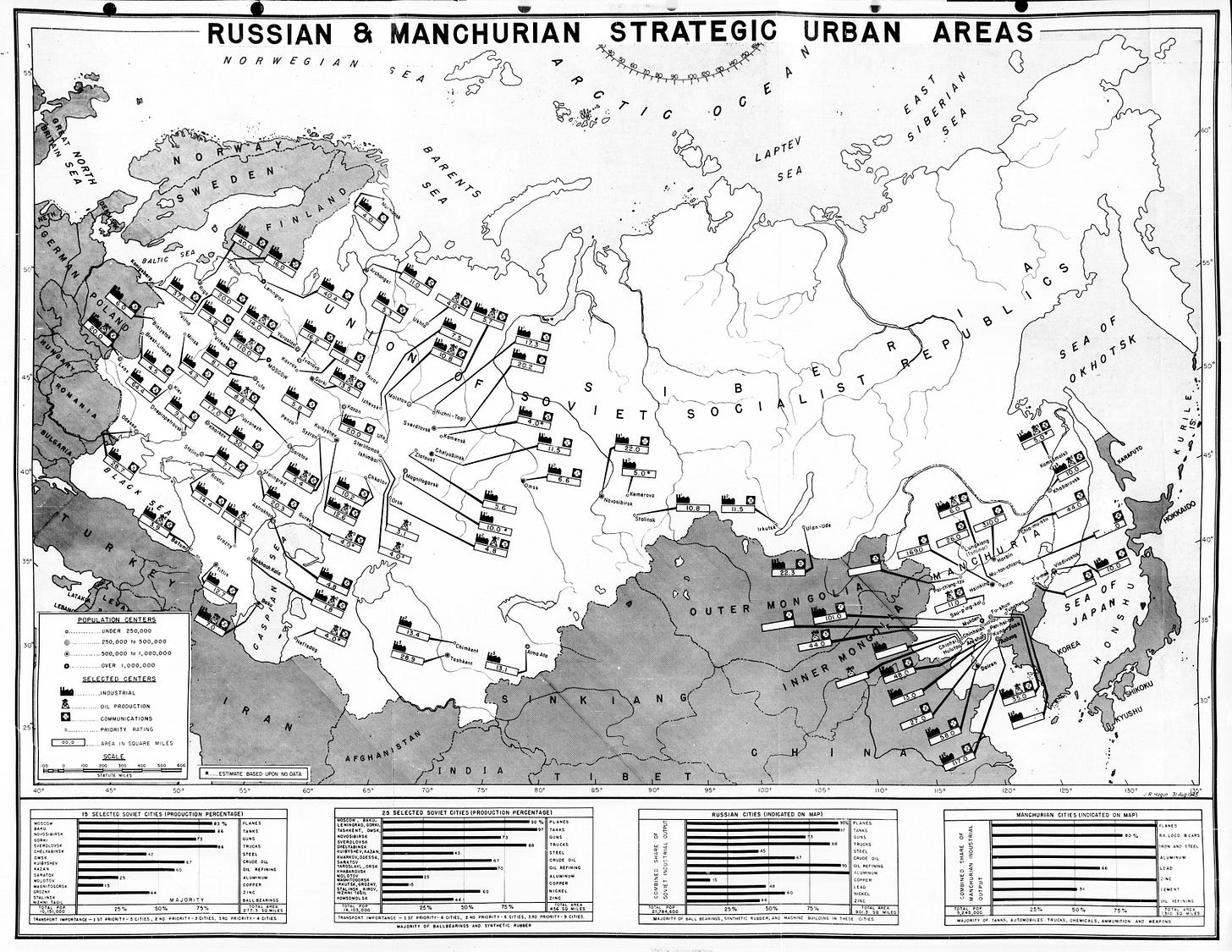 To tackle the issue, the stockpile estimate relies on the data of Intelligence Research Project No. 2532, “A Strategic Chart of Certain Russian and Manchurian Urban Areas,” dated August 30, 1945. This was produced by analysts in the Air Plans Section of Operations Division of the War Department, and consisted of tables of major cities in the Soviet Union and Soviet-controlled Manchuria. Each of these cities were listed by population, approximate area, and their “strategic importance” as measured by their industry, oil, and transportation infrastructure. A fantastic map of the target areas was produced:3