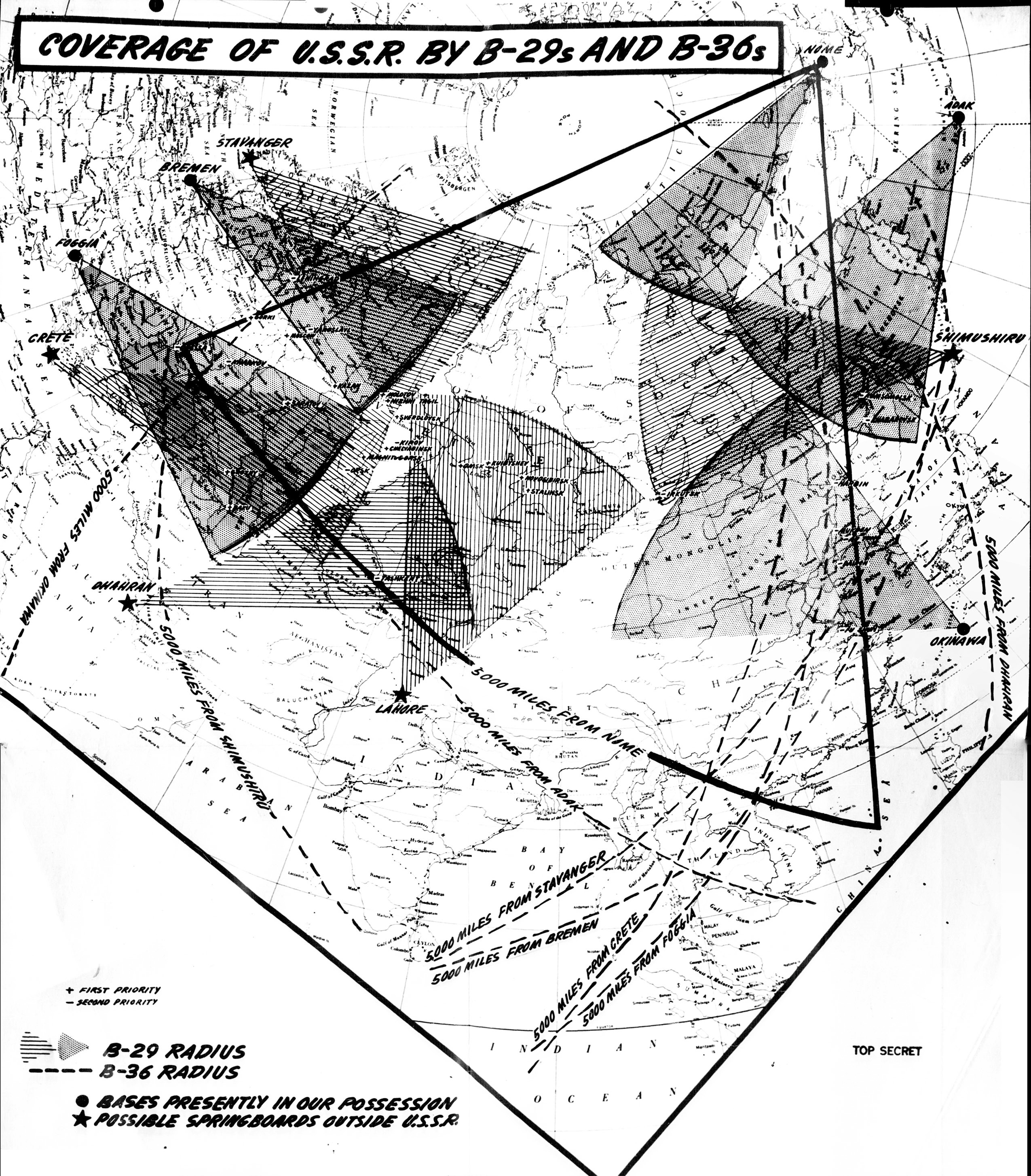 There are answers to this problem, of course. One is to create the means for longer-range delivery of bombs. Another is to station bombers closer to the potential target. The analysts embraced both ideas: the next generation of bomb, the B-36, was planned to have much greater range than the B-29, and certainly in the meantime you could put B-29s much closer to Soviet soil. This, again, they illustrated with a map: