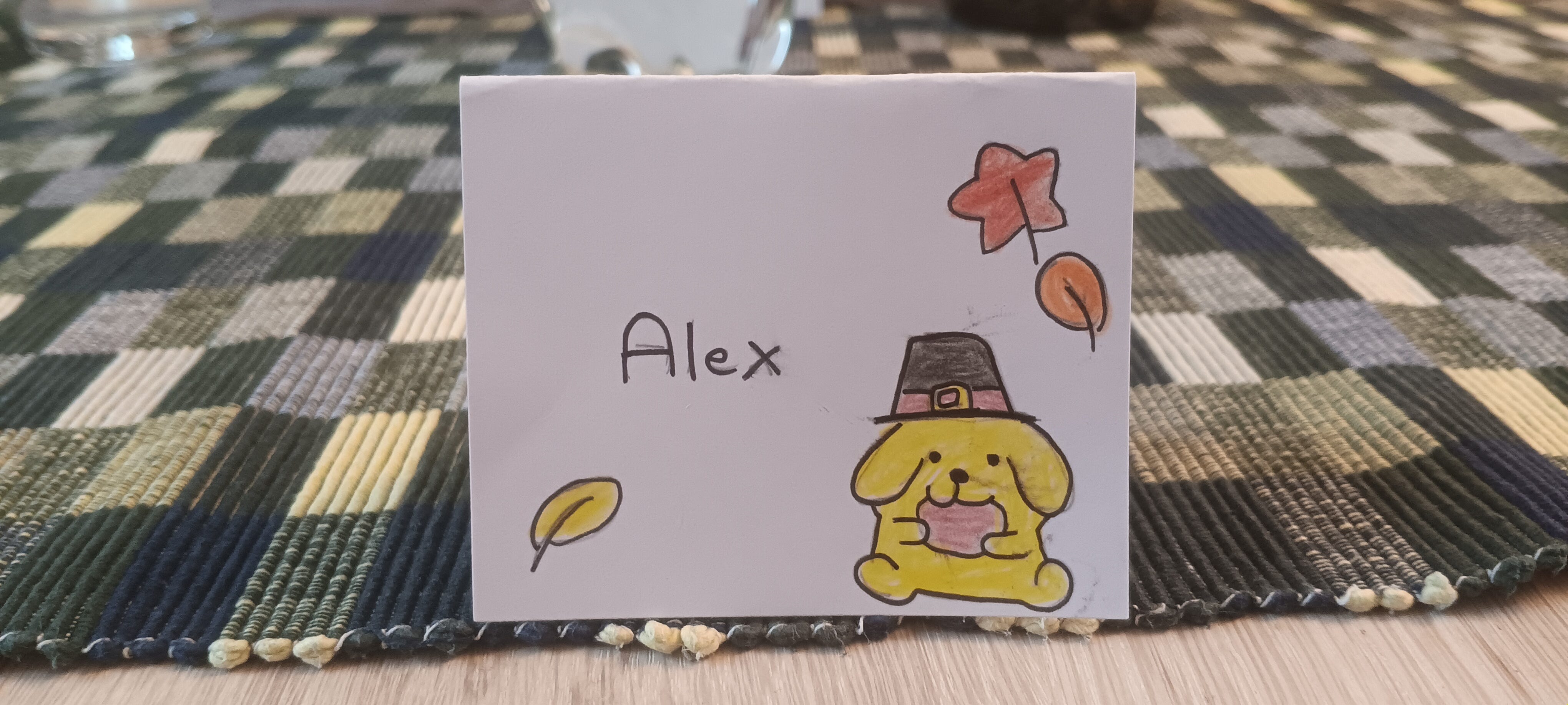 We had two Thanksgivings — one at our place, with Cornish game hens (which we have been serving for years, because they are much easier to prepare than an entire turkey and yet are still somewhat novel, and because we find it amusing that they are neither Cornish, nor game, nor hens), and one at the house of some friends (obviously other expats). The child of our friends made adorable place cards for everyone: