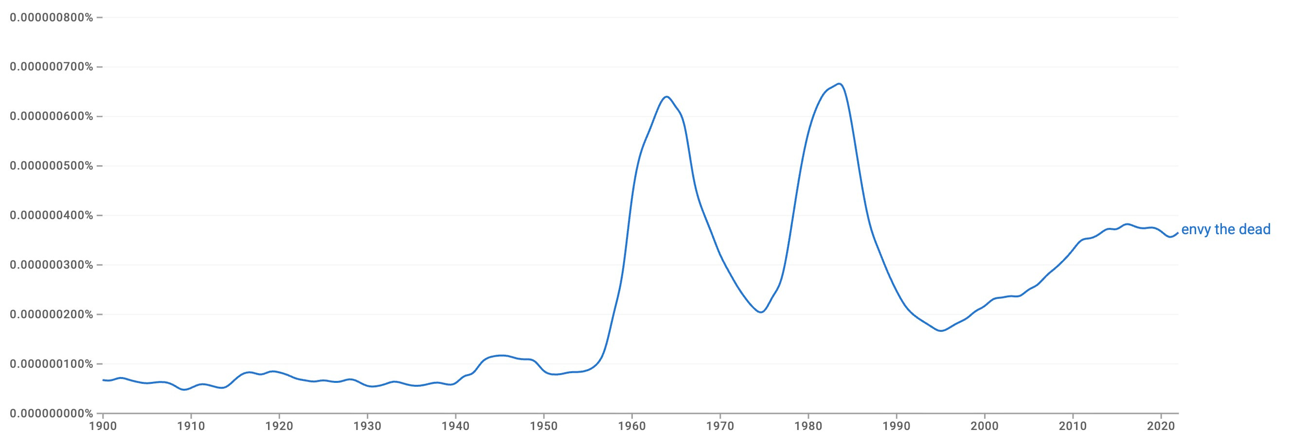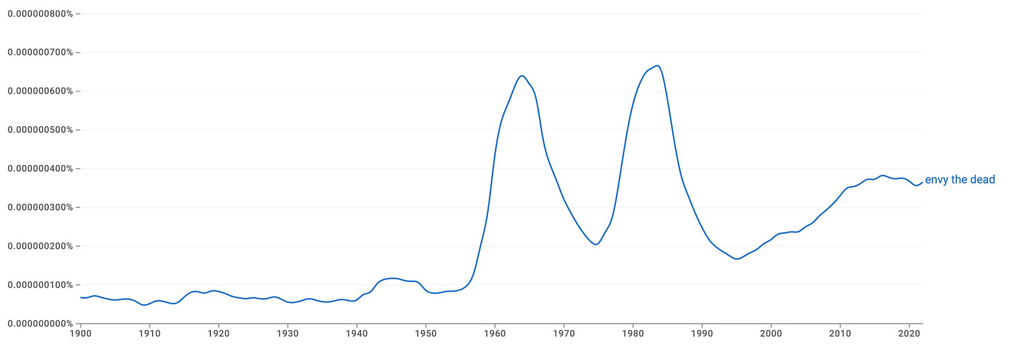 The above is the New International Version of the English translation of the Old Testament. I am no Bible scholar, but a quick perusal of other translations does not reveal any that use the specific phrase “envy the dead.” Nor does “envy the dead” appear to be a direct translation from the original Hebrew.
