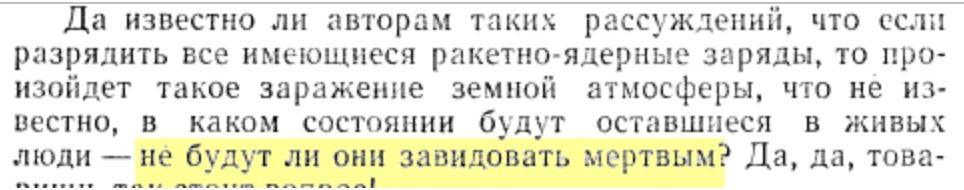 I wonder if the authors of these assertions know that if all the nuclear warheads are detonated the earth’s atmosphere will be so contaminated that nobody can tell in what condition the survivors will be and whether they will not envy the dead. Yes, yes, comrades, that is how the question stands.