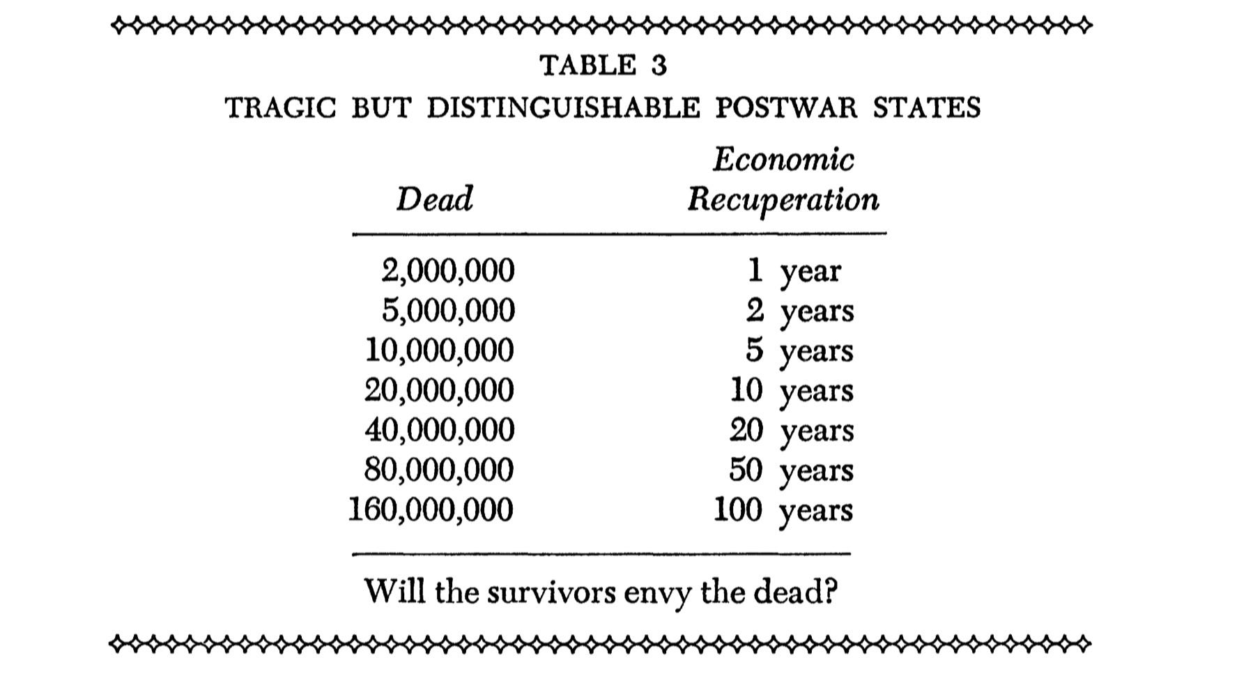 With this framework, Kahn is able to “attack” the question in a variety of ways. Ultimately, Kahn’s argument rests very hard on a table of “TRAGIC BUT DISTINGUISHABLE POSTWAR STATES,” showing different associations between mega-deaths and the time for “economic recuperation”: