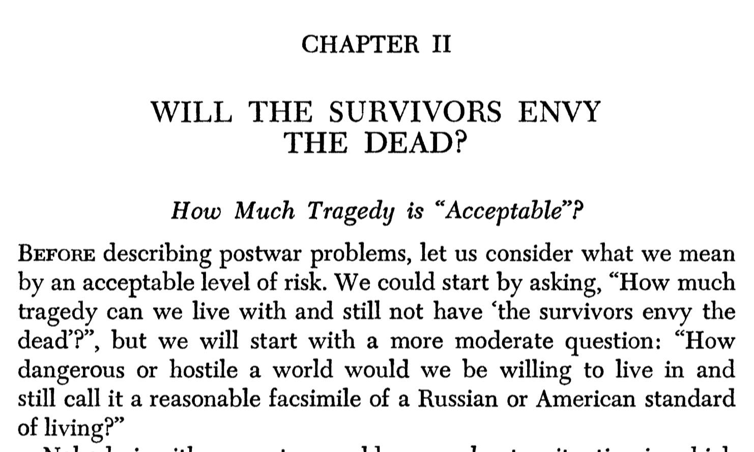 This is quite an interesting shift in framing. Instead of asserting that the survivors will envy the dead, Kahn tries to flip the idea around into a question: “How much tragedy can we live with and still not have ‘the survivors envy the dead?’?” He quickly reduces this to a more measurable question than one of envy, and to instead ask, essentially, at what level of nuclear war would it become impossible to consider one’s self (in some amount of time) as living to a comparable standard of living prior to the nuclear war.