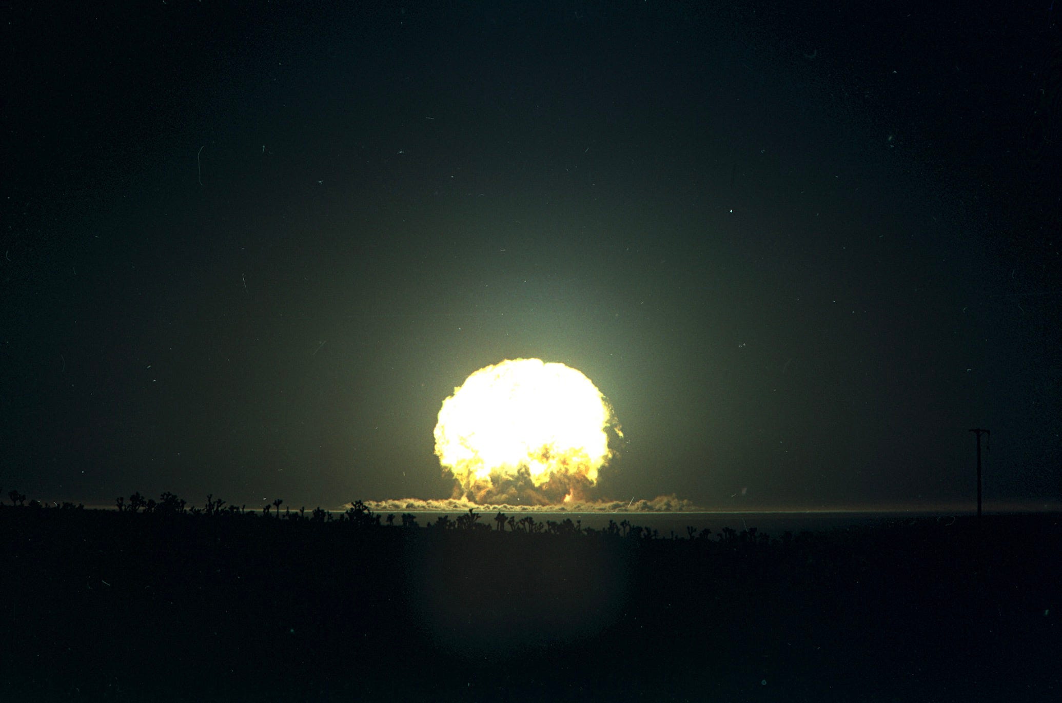 The loudspeaker cackled on again: “This is Dragnet. Stand by for time hack.4 In one minute the time will be H minus two hours. H minus two hours ... thirty seconds ... ten seconds... five, four, three, two, one, hack.” At the instant of hack we saw a small, bright hemisphere of orange fire silently blossom and die far out on the blackness of Yucca Flat.