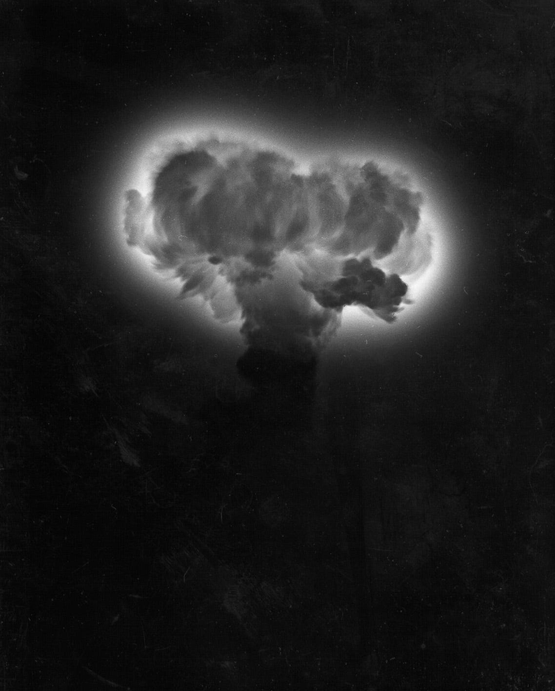 We got set. Some of us debated whether the shock wave could exceed the speed of sound. I didn’t know whether to expect a crack, or a roar, or what. Then I heard what sounded exactly like a long line of freight cars “bumping” in the distance, a low quickly punctuated rumble that lasted three or four seconds and faded away. The cloud, subtending the same angle to the eye as a fifty-cent piece held at arm’s length, bad lost its brilliance. Raggedly oval, it lifted up from the desert. Beneath and around it the dust stood in almost static silhouette.